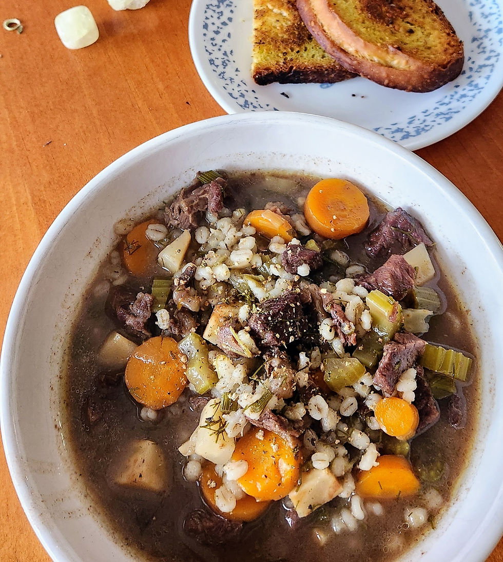 Add Barley: Stir in barley during the last 45 minutes of cooking. Allow it to absorb the broth and thicken the stew slightly. Adjust salt and pepper to taste.