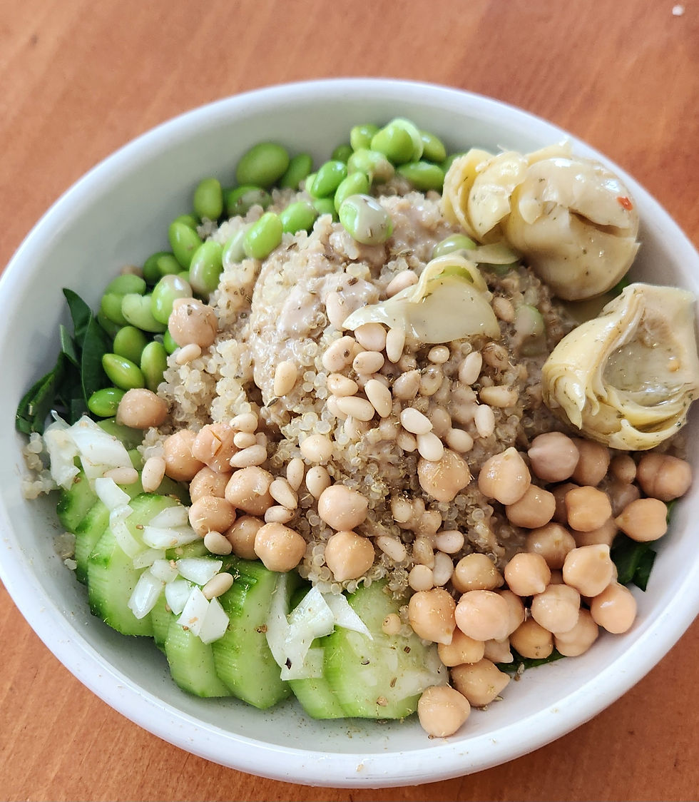 The Lemon-Tahini Harmony Bowl brings together tri-doshic ingredients that are particularly balancing for Pitta and Vata doshas. Quinoa and chickpeas offer grounding and sustaining energy, making this bowl nourishing yet light. Cooling elements like cucumber, spinach, and artichoke hearts gently cleanse the liver and support Pitta balance. Edamame adds protein and a slightly astringent quality, beneficial for Kapha and Vata in moderation. The tahini-lemon drizzle adds unctuousness, which calms Vata, while the lemon-apple cider vinegar dressing stimulates digestive fire (agni) without aggravating Pitta. Pine nuts add a sweet and slightly oily touch to round out the six tastes and offer a satisfying finish. Ideal during warm months or after a period of indulgence.